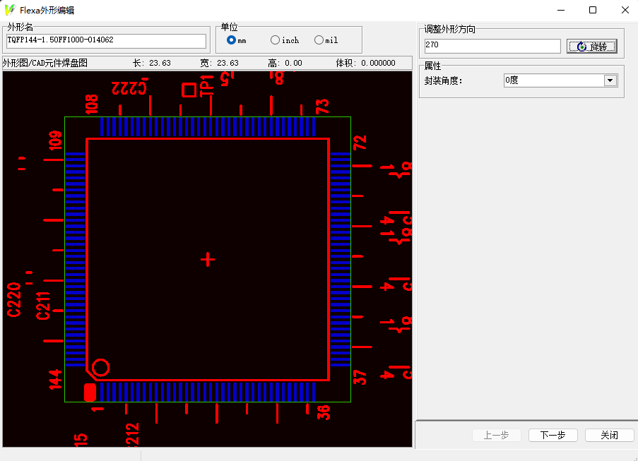 6. 點擊應用隨后就會出現我們的PD庫制作界面,可以選擇輸入的數值單位,調整外形角度的地方可以定義元件的初始角度,這里由于一般IC的0度定義在左下角,因此點擊旋轉,將極性點旋轉到左下角,屬性定義封裝角度為0度。
