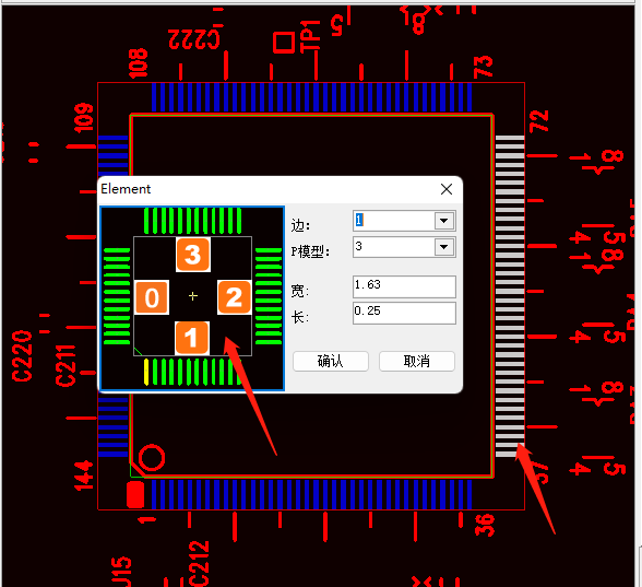 彈出圖中對話框,邊按照圖示,此時我們選擇右邊的引腳,因此選擇“2”,寬和長按照DATESHEET設置最為準確,依次設置好三個邊后就可進行下一步。