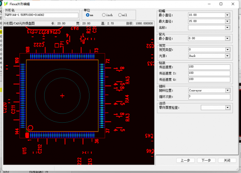 9. 點擊下一步后,就可以設置一些設備參數,吸嘴的最大最小直徑(圖中本體圓形就是吸嘴的圖示大小),或者直接指定固定吸嘴。設置好燈光,貼裝速度等一系列參數后,下一步就可以設置元件的極性點了。